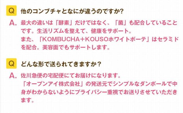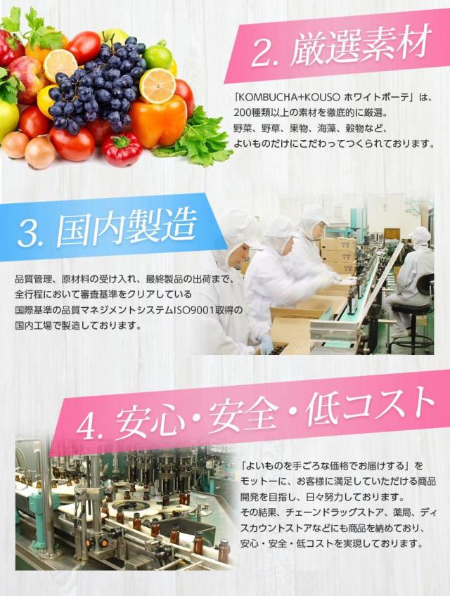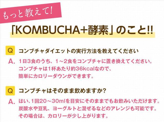 商品説明:今話題のKOMBUCHA(コンブチャ)と200種類の酵素、酵母、乳酸菌等を配合したノンカフェインのドリンクです。インナービューティーに人気のマンゴスチン・プラセンタ・コラーゲン・アミノ酸も配合しています。