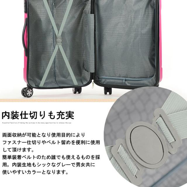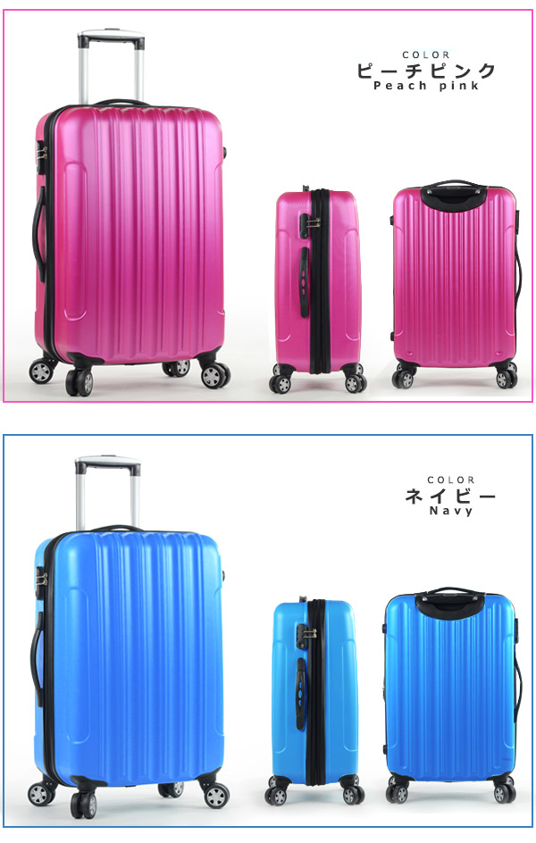 軽量スーツケース。ビジネスにも使えるシンプルデザインであなたを悩ませる16色バリエーション。 2〜3泊の短期旅行や短期出張に最適なサイズなので手軽に使用できます。 360℃回転する車輪を採用し、雑音が少なく静音で、滑らかでスムーズな移 動を可能にしており、旅行の際の移動も楽にし、ストレス少なく気軽に行っ ていただけます。 ハンドル部分には隙間があり、隙間がある事で掴みやすく手に自然にフィッ トいたします。 素材にはゴムを使用しており、旅行の際に長時間スーツケー スを持たないといけない時でも疲れにくいうれしい仕様に♪ プッシュボタンを押して引き伸ばせるキャリーバー。 片手で簡単に操作でき、 旅行時の荷物の多い時でも片手で簡単に操作ができるうれしい仕上がりです♪ スーツケース本体の素材には軽量で強度も強く壊れにくいABS素材を使用し ております。旅行では絶対に必要なスーツケースだから、丈夫で永く使える ものを選びたいですよね。 ビジネスでも旅行でもきっちりと収納していただ けます。仕切りがあり上下で収納ができ、すぐに 取り出したいものを収納できるメッシュポケット。 荷崩れを防ぐゴムのクロスベルトと荷物をたっぷ りと綺麗に収納できます。 ファスナー部分のロックには3桁のダイヤルロックを採用しております。飛 行機やホテルなど目を離さないといけなくなる事が多いスーツケースですが、 こちらのスーツケースはセキュリティ面にもしっかりと配慮しております。 国際線・国内線(100席以上)の機内に持ち込むことができる 幅55cm×高さ40cm×奥行25cm以内に適合したサイズとなっております。 搭乗時や到着後の移動がスムーズにでき、荷物を預けることがちょっと不安 と感じる方におすすめです。 ※LCCを除く航空会社で機内持ち込みしていただけます。また路線、飛行機の種類により機内に持ち込む事が出来ない場合 がございますので、予めご了承願います。 全体サイズ約H55×W40×D22cm(車輪を含む) ケースサイズ約H55×W40×D22cm(車輪を含む) 重量約2.8kg 素材ABS 容量約39リットル キャリーバー地上から最長約86cm |