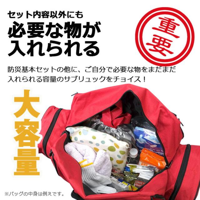 当店大人気オリジナルバッグ リーベンサブリュクの防災セットが登場! 当店だからできる、オリジナルバッグ(リーベンサブリュックcr-310:撥水加工)で作られた非常用持ち出し袋です! オリジナルバッグと、防災グッズを単品で一つずつ揃えられるよりもお得なセット価格となっております! 防災グッズ25点+サブリュックのセットです! サブリュックのカラーが選べる!! このサブリュックは、本体に2か所あるファスナーを開くと、メイン収納部のマチが広がる エクスパンダブル機能が付いています! -セット内容- ■スマートFMラジオ(単4電池×2本使用/別) ■エアーベッド ■携帯用トイレ ×3 ■消音アルミブランケット ■レインコート ■防災手ぬぐい ■軍手 ■マスク ■非常用カイロ(日本製) ■防災用ウェットティシュ(日本製) ■大人用からだふき ■発光スティック ■フラットホイッスル ■7年保存水500ml(日本製) ×2 ■バランススティック(1本60g) ×3 ■わかめごはん ■白飯 ■五目ごはん ■生命のパン ■非常用持出袋 計25点+サブリュックのセットとなります。 ■下記地域へのお届けは、配送の都合上、一部送料のご負担をお願い致します。 ┗離島、沖縄県…2500円 -ご注意- ■商品サイズ・カラーは、企画サイズとなります。 ■商品画像につきましては、モニターの種類・設定等により、実際の商品とは素材感や色味が異なる見え方をする場合があります。 ■細かなキズや、製造上避けられないシミ・シワなどがある場合があります。 ■商品仕様は、予告無く仕様変更される場合がございます。予めご了承下さい。また、セット内容は予告なく同等の品に変更になる場合がございます。 ■商品によっては、他店と在庫共有しているものがございますので、ご注文を頂戴した時点で、 在庫が確保できない商品につきましては、 ご注文をキャンセルさせていただく場合がございます。 なにとぞ、ご了承の程、よろしくお願いいたします。 |