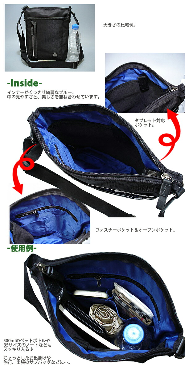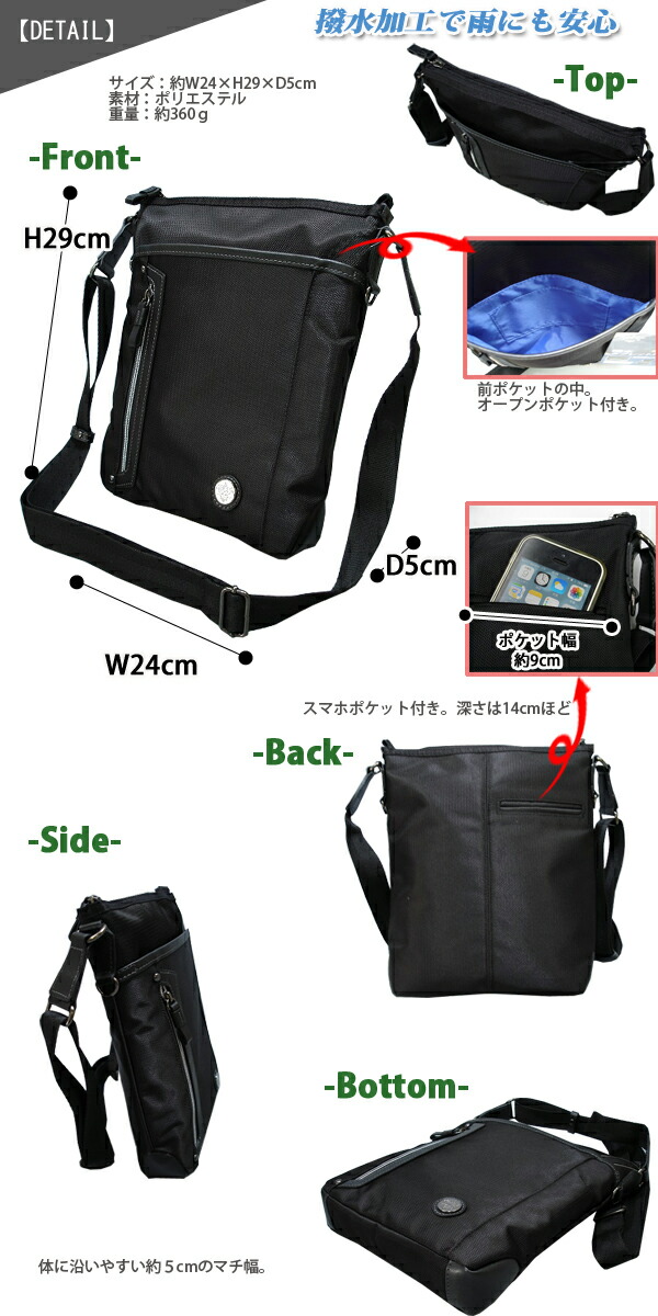 ギャッツビーシリーズより撥水加工された多機能満載のショルダーです! B5サイズ対応、しっかりとした作りの上質な縦型ショルダーです。 小ぶりですが、ポケットも多く、大変使いやすいショルダーになっております! 前面はオープンポケットや縦向きにファスナーポケットが付いています! 本体内部は鮮やかなブルーのインナーで中身も見やすく、背面側にタブレットPC対応のオープンポケット付き。 ファスナーポケットや、携帯電話用、小物用のポケットも付いています! 背面には約W9×T14cmほどの大きさのスマホポケットが付いていて、大変便利です! 男女を問わず お仕事や、旅行、普段使いなどさまざまなシーンでお使いいただけます。 シニアの方にも大人気! 【サイズ】幅24×高さ29×奥行5cm 【重さ】約360g 【素材・成分】ポリエステル 【生産国】ベトナム | |