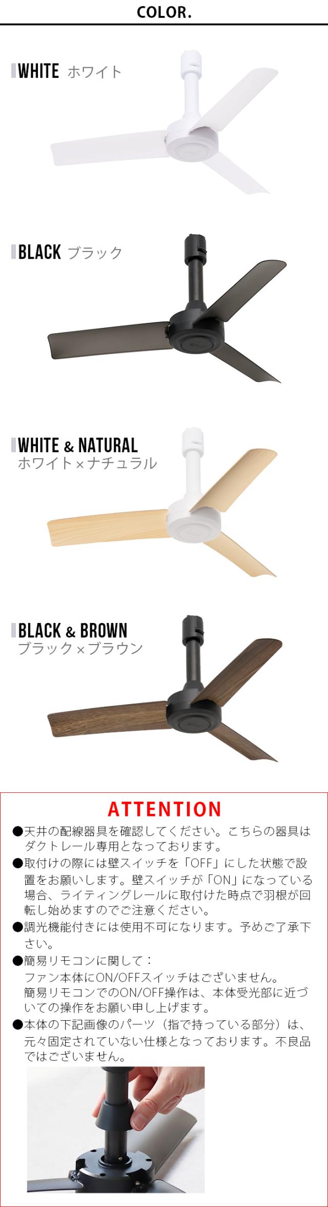 | 天井の配線器具を確認してください。こちらの器具はダクトレール専用となっております。 調光機能付きには使用不可になります。予めご了承下さい。 取付けの際には壁スイッチを「OFF」にした状態で設置をお願いします。壁スイッチが「ON」になっている場合、ライティングレールに取付けた時点で羽根が回転し始めますのでご注意ください。 簡易リモコンに関して: ファン本体にON/OFFスイッチはございません。 簡易リモコンでのON/OFF操作は、本体受光部に近づいての操作をお願い申し上げます。 本製品はモーターが内蔵されている為、 モーター特有の音が発生します。 下記のような場合は火災や落下の恐れがありますので、取り付けることができません。ダクトレールが天井に確実に取り付けられていることをお確かめください。 ・床面× ・レールがグラついている× ・2.0m以下の天井や梁への取付× 壁スイッチをOFFにした状態で設置してください。 ファンの羽根は必ず3枚取付て運転してください。回転が不安定となり、落下や怪我の原因となります。 万一羽根を破損した場合は必ず3枚とも交換してください。破損した羽根だけを交換しますと、振動の原因になります。 天井直付けダクトレールではない場合、リモコンが反応しにくい場合があります。 燃焼機器の燃焼部に風が直接当たるところで使わないでください。不完全燃焼したり、炎が消えたりして、一酸化炭素中毒を起こすことがあります。 |