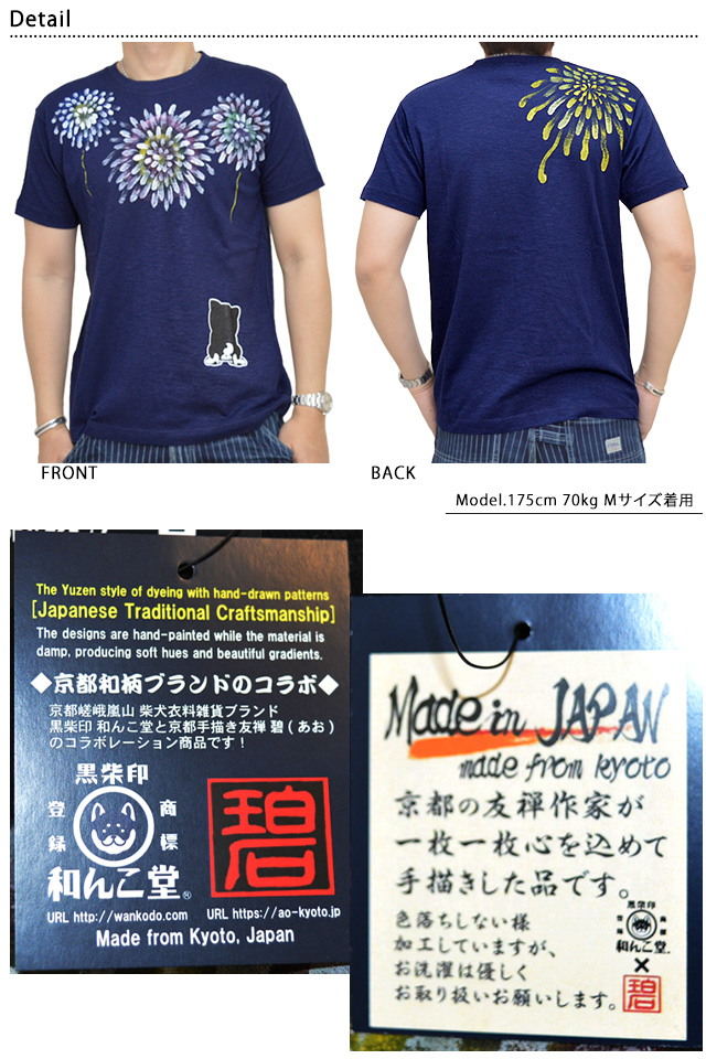 京都嵯峨嵐山柴犬衣料雑貨ブランド、黒柴印「和んこ堂」から「和んこ堂×碧コラボ 花火と黒柴半袖Tシャツ(KDW2320M)」のご紹介です。 京都発の和犬ブランドです。 京都手描き友禅ブランド「碧」との夢のコラボが実現しました! フロント左裾には、黒柴の後ろ姿をプリント。 ボディーには、さらりとした肌触りのスラブ生地を採用。 | ||||||||||||||||||||