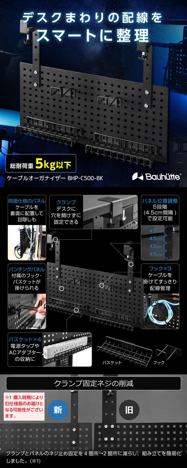 Bauhutte バウヒュッテ ケーブルオーガナイザー BHP-C500-BK ケーブルオーガナイザー ゲーミング家具 在宅 リモート