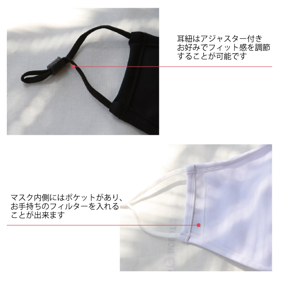 水着素材なので乾きやすい!マスクの裏地にポケットが付いており、ガーゼやフィルターを入れて使用することもできます。