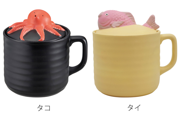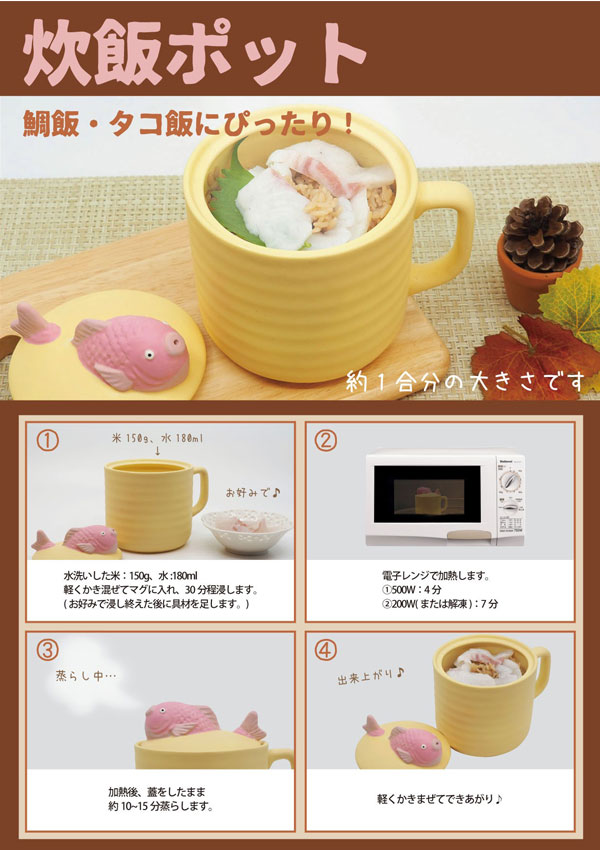 土鍋がなくても、簡単に一人分の鯛飯やタコ飯が楽しめます。持ち手としても使えるように蓋にはタイとタコが付いているユニークなデザインです。