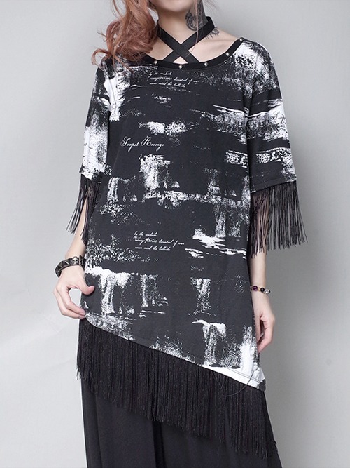 胸元のクロスベルトとパンキッシュなオリジナル総柄のデザインカットソー。総柄にはSEXPOTのロゴや隠れスネークが! 袖と裾にフリンジが付いたモードなデザインです。■Fringe (フリンジ)関連商品