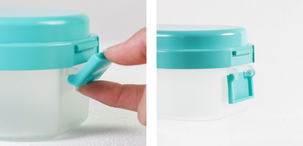 パッキンが付いた蓋と2点ロック式で蓋をしっかり固定できるので持ち運ぶ時も安心です。留め具は上らか下へ押して外し、カチッと止まるようになっています。留め具は蓋を冷凍庫に入れやすいよう本体に付いています。
