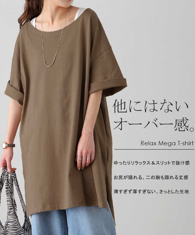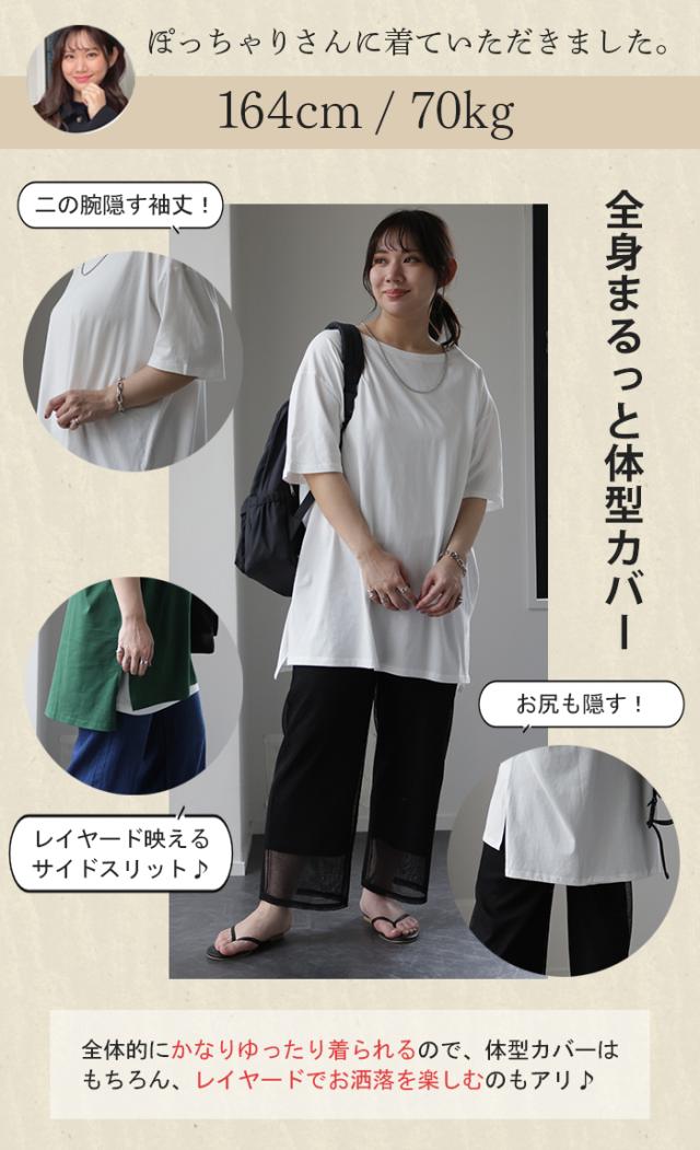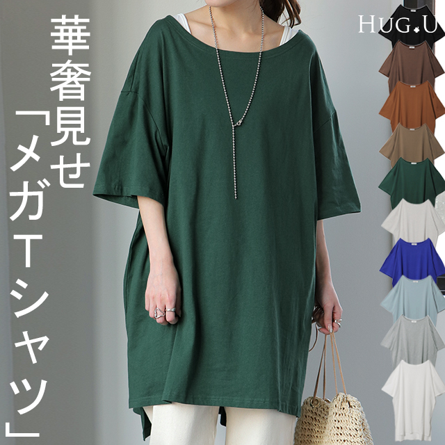 送料無料 メガT 大きい Tシャツ トップス レディース カットソー チュニック 半袖 ビッグシルエット ビッグ ゆる ドロップショルダー Uネック 無地 ロング スリット お尻が隠れる 二の腕カバー 黒 HUG.U 夏 秋 秋新作