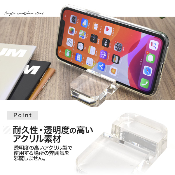 スマホスタンド Sサイズ アクリル製 卓上 スマートフォン スタンド 携帯スタンド 組立て不要 軽量 持ち運び 便利 ミニサイズ 小型 透明 シンプル クリア テレワーク 机 勉強机 作業台 オフィス 事務所 スマホ スピーカー代わり 多機種対応 iPhone Xperia