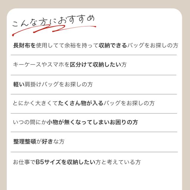 ・長財布を使用してて余裕を持って収納できるバッグをお探しの方 ・キーケースやスマホを区分けて収納したい方 ・軽い肩掛けバッグをお探しの方 ・とにかく大きくてたくさん物が入るバッグをお探しの方 ・いつの間にか小物が無くなってしまいお困りの方 ・整理整頓が好きな方 ・お仕事でB5サイズを収納したい方と考えている方 |