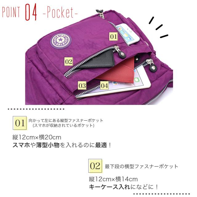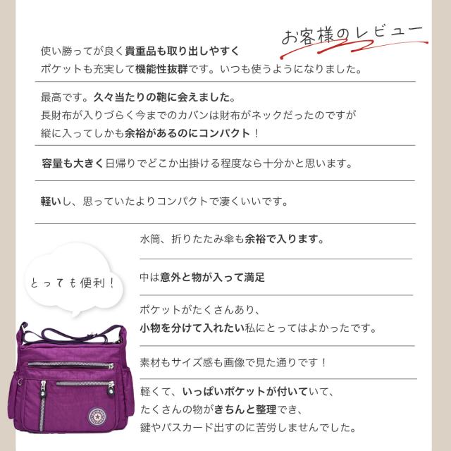 ・使い勝ってが良く貴重品も取り出しやすくポケットも充実して機能性抜群です。いつも使うようになりました。 ・最高です。久々当たりの鞄に会えました。長財布が入りづらく今までのカバンは財布がネックだったのですが縦に入ってしかも余裕があるのにコンパクト! ・素材もサイズ感も画像で見た通りです! ・軽いし、思っていたよりコンパクトで凄くいいです。 ・水筒、折りたたみ傘も余裕で入ります。 ・中は意外と物が入って満足 ・ポケットがたくさんあり、小物を分けて入れたい私にとってはよかったです。 ・容量も大きく日帰りでどこか出掛ける程度なら十分かと思います。 ・軽くて、いっぱいポケットが付いていて、たくさんの物がきちんと整理でき、鍵やパスカード出すのに苦労しませんでした。 |