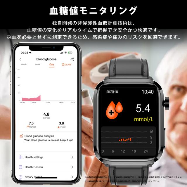 関連機能ド:スマートウォッチ 医療レベル 体温測定 採血不要 血糖値測定器 血圧計 心拍計 歩数計 心電図 ECG+PPG 血糖値 睡眠計 血中酸素濃度計 腕時計 Bluetooth通話 sos 呼吸訓練 睡眠改善 1.96インチ大画面 スマートブレスレット 日本語説明書 着信通知 電話拒否 睡眠検測 アラーム 時計 血圧正確 腕 誕生日 消費カロリー 睡眠モニター スポーツ 血圧測定 心拍 P67防水 GPS連携 日本語 血圧