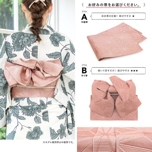 帯は、体に巻いて後ろで結ぶタイプの半幅帯、または作り帯からお選びいただけます。モデル着用は半幅帯です。