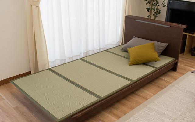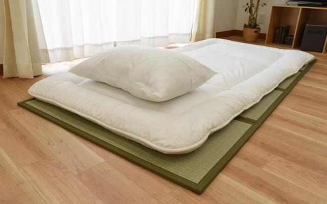 フローリングにそのままお布団を敷くと、寝ている間にかいた汗による湿気が布団とフローリングの間にたまってムレを感じるだけでなく、カビや雑菌の原因にも…そこでおすすめなのが、い草でできたマットレス!天然素材のい草は吸湿性に優れているため、布団の下に敷くことで湿気を吸収し、ムレを防止してくれます。また、ほどよいクッション性があるため、敷き布団の底付き感も軽減します。