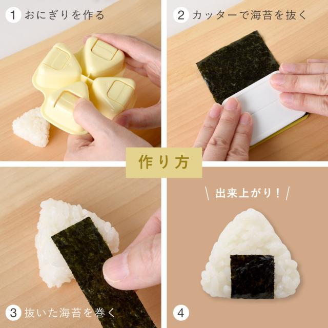 小さな三角おにぎりが一度に4つ作れるおにぎり型と、海苔をカットできる専用カッターのセット。長方形の海苔を巻くだけで、誰でも簡単にきれいな三角おにぎりが完成します。形を変えることで食べる楽しさが増し、食事への興味づけにもつながります。