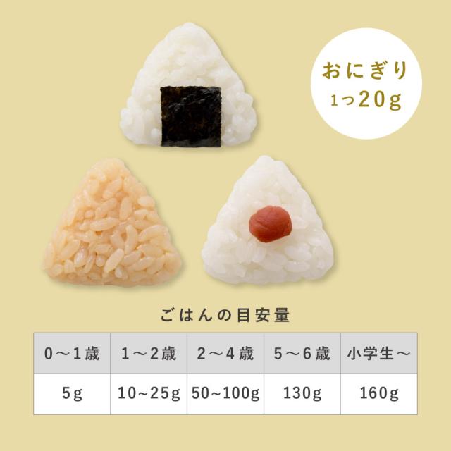 おにぎり1つあたり約20gのひとくちサイズで、小さなお子さまでも持ちやすく食べやすい大きさ。食べる量も個数で調整しやすく、成長に合わせた食事管理ができます。型に詰めて抜くだけの簡単操作で、忙しい朝でも手早く作れます。