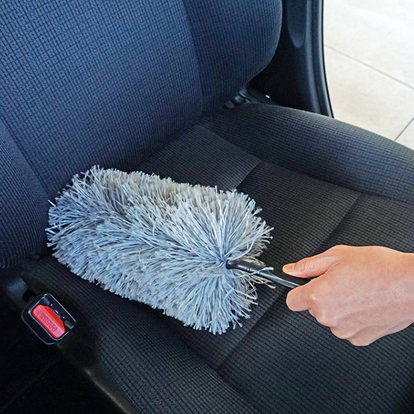車内のホコリや花粉などの細かい汚れを「吸着」するだけでなく、砂粒やお菓子のかすなど大きめのゴミの「掃き出し」が素早く完了する車内クリーニング専用のハンディモップ。
