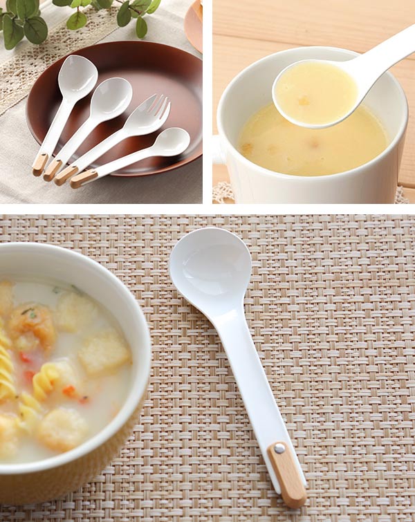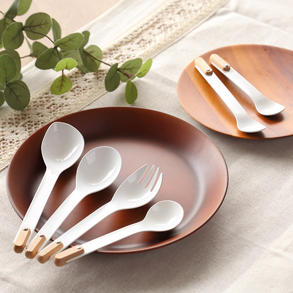 ひとつひとつ職人の手によって作られた、琺瑯(ホーロー)のメルテシリーズ。上品で清潔感のあるホーローの白に木のワンポイントが食卓をナチュラルな雰囲気にしてくれます。用途に合わせた先端形状による使いやすさも特徴です。