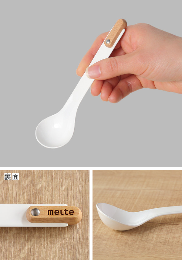 口あたりを良くするため、強度を保ちつつより薄く仕上げました。木の裏側にはシリーズ名「melte」が刻印されています。深さのある丸い先端形状は、小さいカップでもしっかりとすくえます。