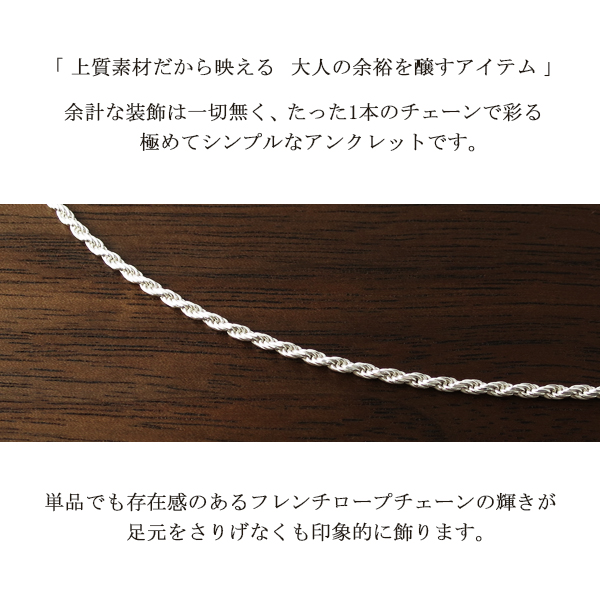 (レディースアクセサリー レディースジュエリー シルバーアクセサリー シルバージュエリー シルバーアンクレット シルバーチェーン チェーンアンクレット フレンチロープチェーン デザインチェーン 重ね付け 重ね着け 重ねづけ なめらか 高見え 高級感 シンプル さりげない 大人 かっこいい クール マニッシュ スタイリッシュ スマート かわいい 大人かわいい 甘辛 きらきら ミサンガ 綺麗 きれい 小さめ 細め 華奢 きれいめカジュアル 上品カジュアル パーティー オフィス 職場 仕事)