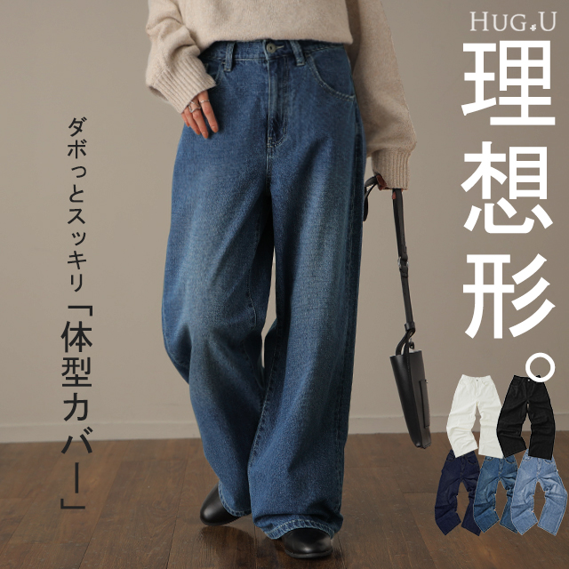 「ダボ × スッキリ」デニム パンツ レディース ストレートパンツ ジーンズ ボトムス ゆったり ワイドパンツ ボーイフレンドデニム ボーイフレンド ストレート ワイド ロング ズボン デニムパンツ ボトム 体型カバー 大きいサイズ 冬 秋 HUG.U 秋新作