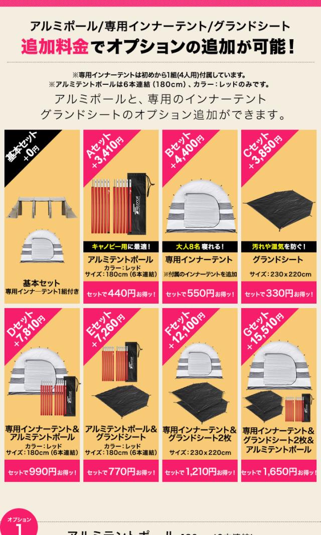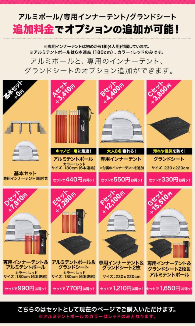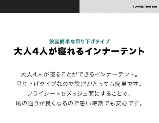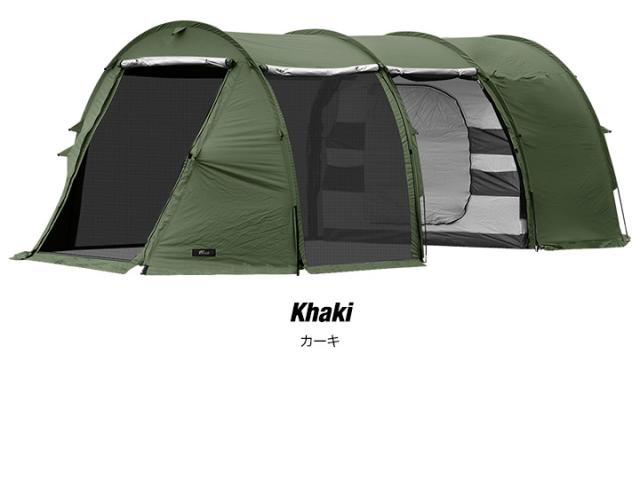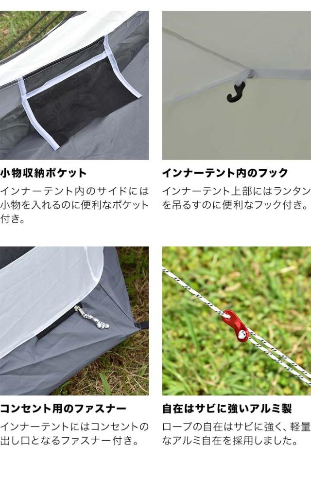| 付属品: ・テント本体×1 ・インナーテント×1 ・ポール×4 ・ペグ×26 ・ロープ×15 ・専用収納バッグ×1 ・取扱説明書(日本語) |