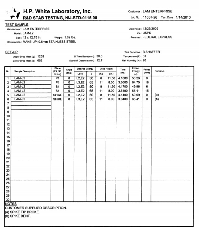 両刃ナイフ 43J対応:防刃レベル“?”(NIJ-STD-0115.00)H.P.White.Lab