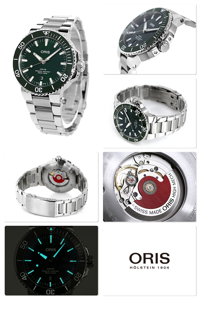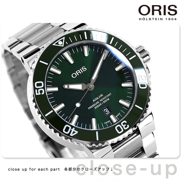 正規品 7年保証キャンペーン オリス アクイス デイト 43.5mm スイス製 自動巻き メンズ 腕時計 733-7730-4157M ORIS AQUIS Date アナログ グリーン ◆ORIS(オリス)は、ポール・カッティン氏とジョージ・クリスチャン氏の2人によってスイスのヘルシュタインで創設されました。近くを流れる小川にちなんで社名をオリスと命名。手頃な価格ながら、革新的で高機能かつ実用的な機能を備えた本格機械式時計で知られ、世界中の時計ファンから愛されているブランドです。 ダイバーズウォッチラインの中でも人気の「アクイス」シリーズ。見やすく操作しやすい大振りの逆回転防止ベゼルや堅牢なケース、視認性を保つための夜光塗料などの高スペックを誇るモデル。ビジネスシーンでもお使いいただけるシックなデザインもポイント。カジュアルスタイルにはもちろん、クラシックな大人の装いにも味わいを添えてくれます。また、裏蓋はスケルトン仕様になっており、機械式ならではのムーブメントを見てお楽しみいただけます。 機械式腕時計