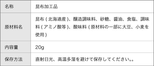 【原材料名】昆布(北海道産)、醸造調味料、砂糖、醤油、食塩、調味料(アミノ酸等)、酸味料 (原材料の一部に大豆、小麦を使用)