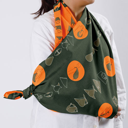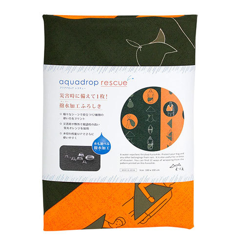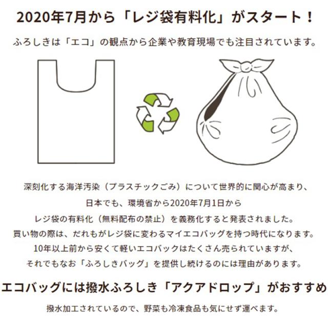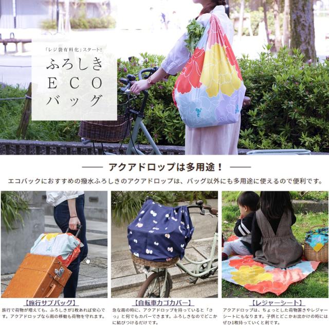 ふろしきの特徴の一つである多用途性は日常だけでなく、災害時にも有効です。12種類の使い方を模様にしたふろしきは防災用品として1枚備えておくと便利です。災害時に見つけやすいオレンジの蛍光色は機能面だけでなく、包んだときのアクセントとして効果的にデザインを引き締めています。アウトドア・雨の日にも使える撥水加工のふろしき「アクアドロップ」がリニューアル。水切れ性能がUPし、薄くやわらかな肌触りになりました。水をはじくので、突然の雨から大事なバッグや荷物をカバーしたり、レジャーシートやテーブルクロスとしてなど様々なシーンでご利用いただけます。深刻化する海洋汚染(プラスチックごみ)について世界的に関心が高まり、日本でも、環境省から2020年7月1日からレジ袋の有料化(無料配布の禁止)を義務化すると発表されました。買い物の際は、だれもがレジ袋に変わるマイエコバッグを持つ時代になります。エコバッグには撥水ふろしき「アクアドロップ」がおすすめです。撥水加工されているので、野菜も冷凍食品も気にせず運べます。「ふろしきバッグ」のいいところふろしきは「結ぶ」ことで、長い物も運べたり、開閉式にできたり、固定したり柔軟にさまざまなものを運ぶ事ができます。ふろしきに出来て、市販のエコバックには出来無い役割もこなしてくれます。
