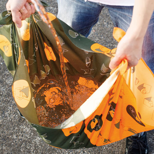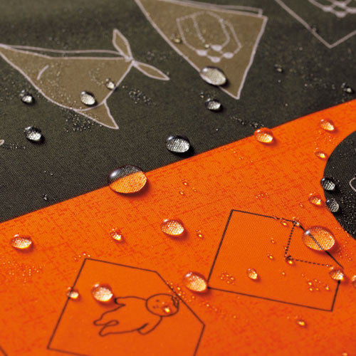 ふろしきの特徴の一つである多用途性は日常だけでなく、災害時にも有効です。12種類の使い方を模様にしたふろしきは防災用品として1枚備えておくと便利です。災害時に見つけやすいオレンジの蛍光色は機能面だけでなく、包んだときのアクセントとして効果的にデザインを引き締めています。アウトドア・雨の日にも使える撥水加工のふろしき「アクアドロップ」がリニューアル。水切れ性能がUPし、薄くやわらかな肌触りになりました。水をはじくので、突然の雨から大事なバッグや荷物をカバーしたり、レジャーシートやテーブルクロスとしてなど様々なシーンでご利用いただけます。深刻化する海洋汚染(プラスチックごみ)について世界的に関心が高まり、日本でも、環境省から2020年7月1日からレジ袋の有料化(無料配布の禁止)を義務化すると発表されました。買い物の際は、だれもがレジ袋に変わるマイエコバッグを持つ時代になります。エコバッグには撥水ふろしき「アクアドロップ」がおすすめです。撥水加工されているので、野菜も冷凍食品も気にせず運べます。