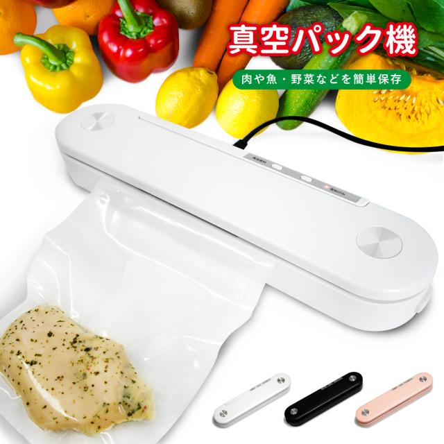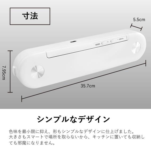 | 【 鮮度長持ち 】 真空密封することで袋の中の空気を減らし、食材の酸化や腐敗を遅らせることで鮮度を長持ちさせます。 【 簡単操作 】 本体には「真空密封」ボタンと「密封のみ」ボタンの2ボタンのみで複雑な操作はいりません。 食材を専用袋に入れてセットし、ボタンを1回押すだけですぐにスタートします。 【 省スペース 】 下拵えした食材を真空パックにすると、保存容器や瓶を使って保存する場合に比べて容量を減らすことができます。 冷凍庫や冷蔵庫内で保存する際もすっきりと重ねて保存すれば、スペースも小さくて済みます。 積み重ねたり縦置きにしたり、スペースに合わせて保存できるなどとても使い勝手に優れます。 収納力がアップすれば幅広く食材をストックできるようになります。 【 コンパクトかつスタイリッシュなデザイン 】 デザインはシンプルですっきりとしており、キッチン等に置いても邪魔になりにくいコンパクトなサイズを採用しております。 【 冷却モード 】 連続で運転し一定の温度を超過すると、本体の故障を防ぐため自動で「冷却モード」に入ります。 |