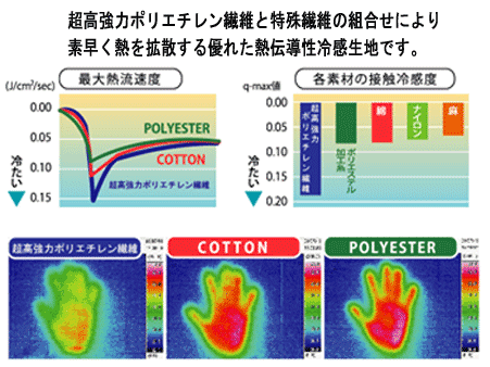 ●「超高強力ポリエチレン繊維」は素早く"熱"を拡散する、優れた「熱伝導性冷感生地」 ポリエステルや綿、麻等の素材に比べて接触冷感度が2倍と高く、暑い夏場でもひんやり快適に過ごすことができます。