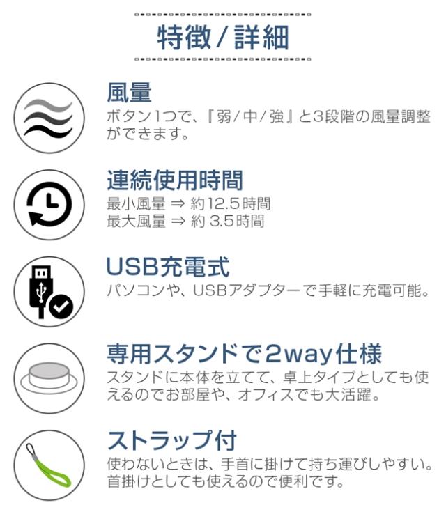 | 【風量調節】3段階(弱⇒中⇒強) 【連続使用時間】約3.5〜12.5時間 【充電時間】約2.5時間 【充電電池】リチウムイオン蓄電池(2000mAh) 【入力】DC 5V 800mA(USB充電式) 【羽根】3枚羽根 |