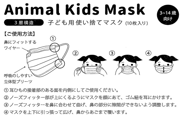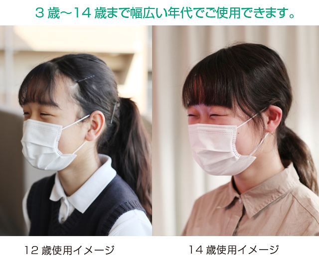 3歳〜14歳まで使える使い捨てマスク。呼吸のしやすい立体型プリーツ。
