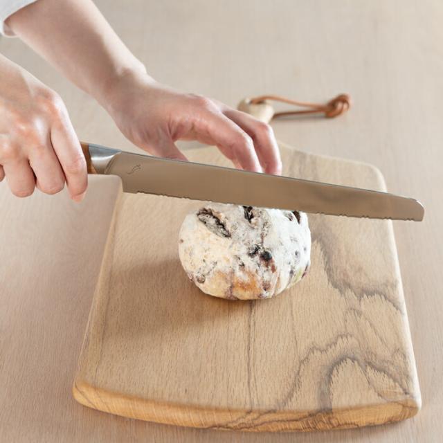 パン切包丁は独自の大小のギザ刃を組合せることで、硬いパンから柔らかいパン、サンドウィッチまで、切る位置を気にすることなく刃元から先端まで切り易いところで美しく切ることができます。