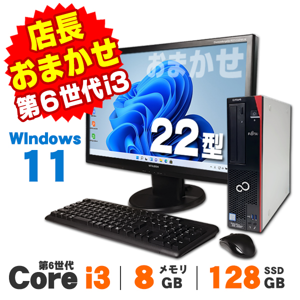 【AIかんたんPC】デスクトップパソコン 中古 22型ワイド液晶セット Windows11 おまかせデスクトップPC 第6世代 Core i3 メモリ8GB SSD128GB DVDROM Windows11 Pro Office付き