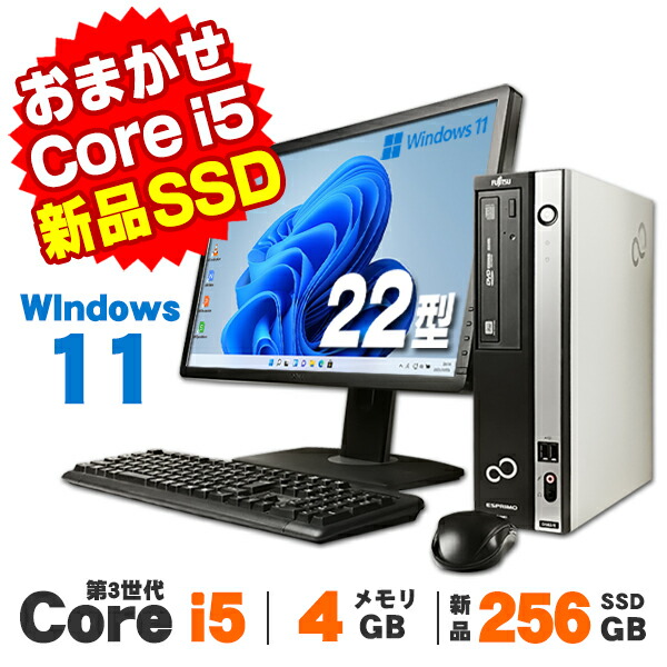 中古 デスクトップ Windows11 新品SSD256GB おまかせデスク Core i5 デスクトップパソコン 22型ワイド液晶セット メモリ4GB DVDROM Windows11 64bit Kingsoft WPS Office付き 新品キーボード&マウス付属