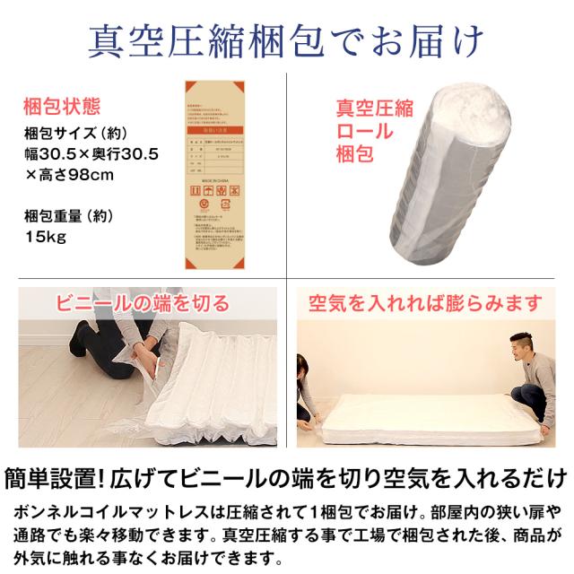 ・マットレスを圧縮しているパック内に空気が入るとマットレスはすぐに膨らみます。膨らむ際にスプリング同士がこすれる音がしますが不良ではありません。