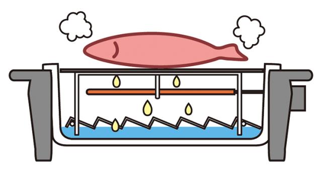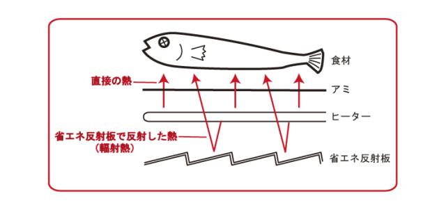 ヒーターの下に反射板を置くことで、下へ逃げていたヒーターの熱が上に反射され、効率よく食材を焼き上げます。