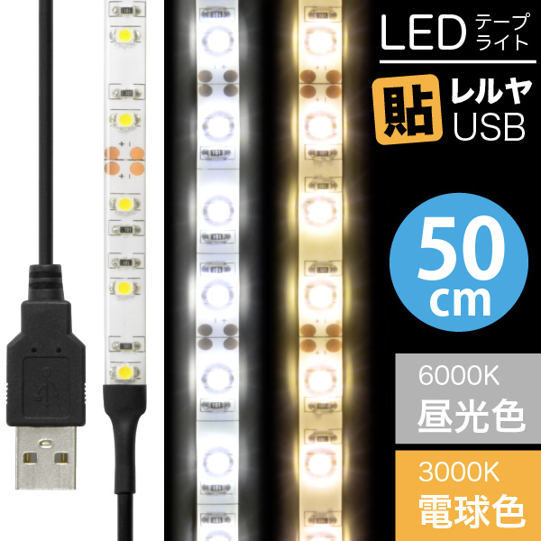 LED USB 照明 テープライト 貼レルヤ(昼光色/電球色 50cm)30灯 貼り付けて使える粘着テープ付 ハサミでカットして長さの調節可能