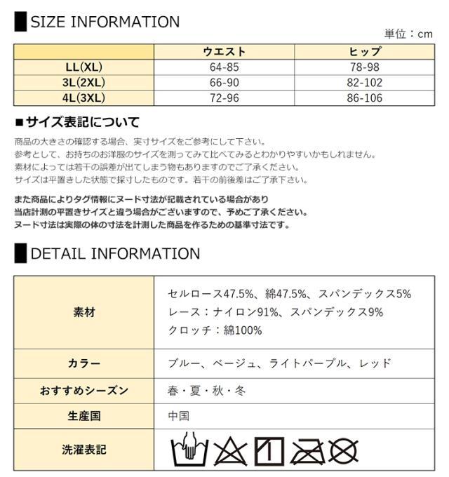 | 素材 | セルロース47.5%、綿47.5%、スパンデックス5% レース:ナイロン91%、スパンデックス9% クロッチ:綿100% |