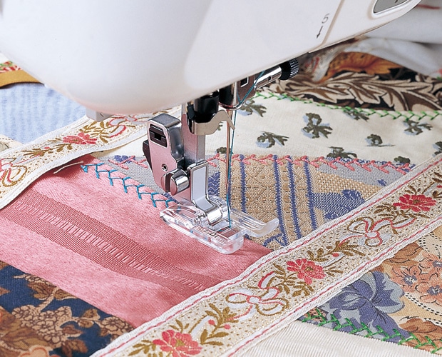 押えが透明なのでクレージーキルトやつき合わせぬいなどで飾りぬいをする時、ぬい目が見易くてとっても便利です。