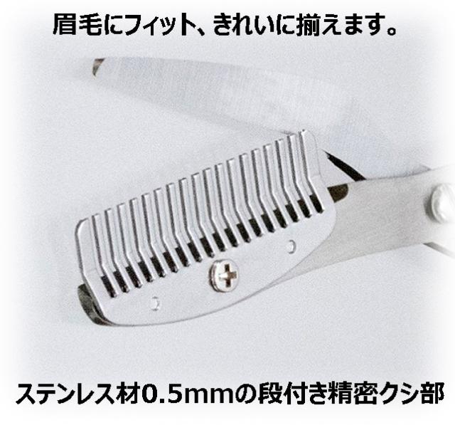 ●0.5mmのステンレス材を使用した段付きで精密なクシ部は眉毛にフィット。クシ部とカット部が密着しているから眉毛が短めにカットできます。