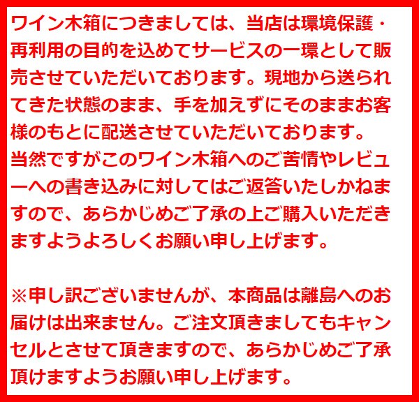 ※ ワイン木箱は木箱がご用意でき次第出荷させていただきます。申し訳ございませんが着日指定・時間指定は承っておりません。又、商品到着まで多少お時間を頂く場合がございます。(お届けの目処は1週間〜10日前後)あらかじめご了承くださいませ。