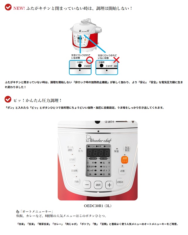 商品名 ワンダーシェフ 電気圧力鍋「楽ポン」OEDC30 R1(ST) メーカー型番 OEDC30 R1(ST) メーカー保証期間 1年間 電源方式 AC100V 消費電力 750W 調理容量 2L 満水容量 3L コードの長さ 1.5m 本体サイズ 幅30.4×奥行き27×高さ27.8cm 本体重量 3.7kg 付属品 取扱説明書、クッキングブック(24レシピ)、掃除ピン、計量カップ