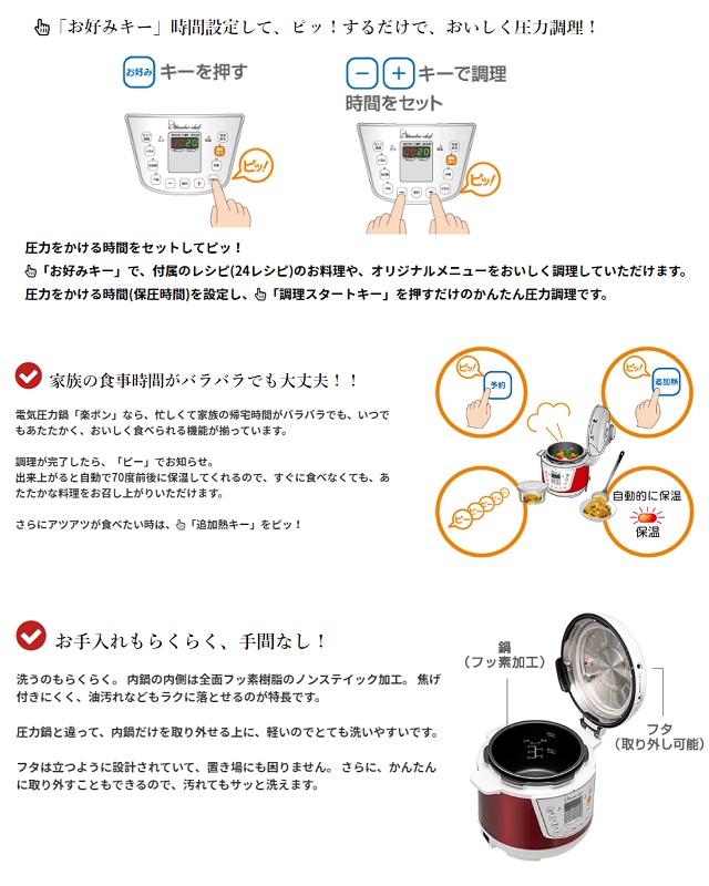 ●材料入れてボタンを押すだけ。簡単&ほったらかしで本格圧力料理●火力の自動調節で失敗を防止。調理が終われば自動で保温