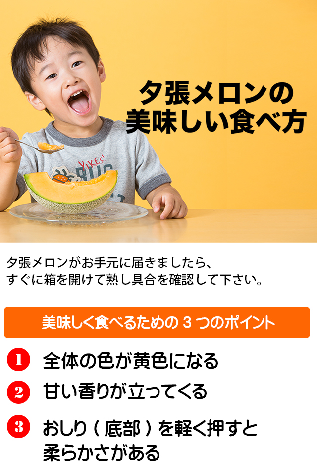 - 夕張メロンを5月の上旬にお願いしました。7月18日に着いて、すぐに開けました。 中に食べ頃の説明書が入っていまして、緑色の外観から黄色の外観に変われば、食べ頃とありました。入っていたメロンはすべて黄色でけっこう柔らかくすぐに食べなければならない状態のようでした。甘くおいしかったですけど緑色の外観からゆっくり楽しみたかったです。家庭用訳ありの商品お願いしましたので、こんなものかと。甘く美味しく頂きましたので良かったです。