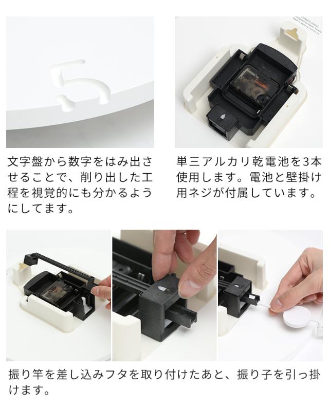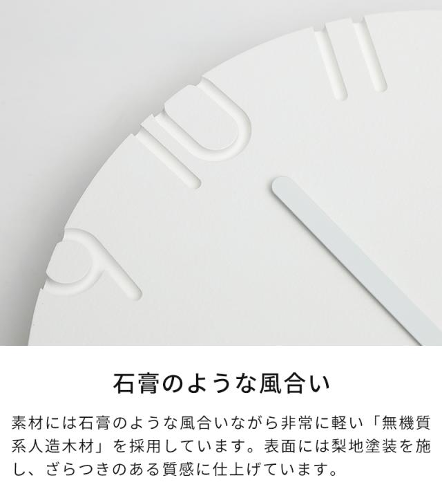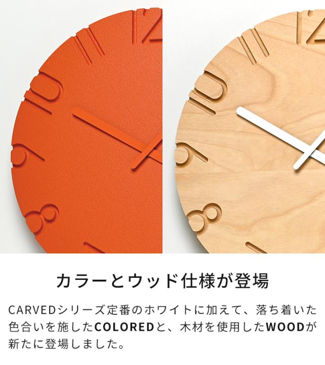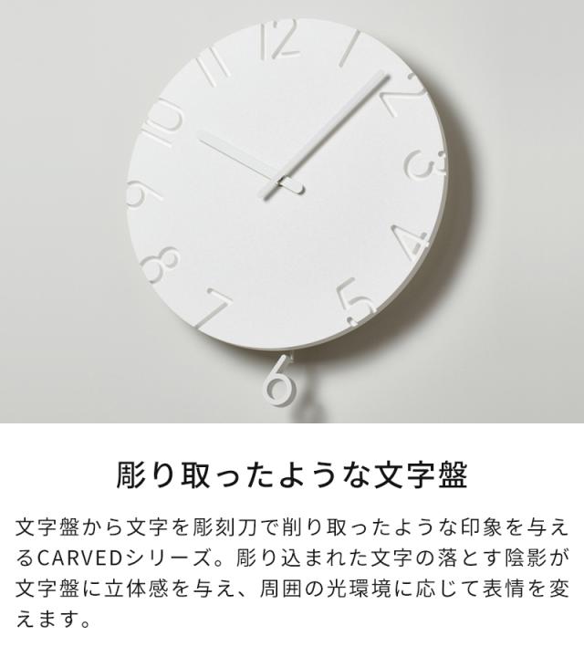 文字盤から文字を削り取ったような印象を与える「CARVED/カーヴド」シリーズの振り子時計。削り取った文字がこぼれ落ちて振り子になったユニークなデザインです。彫り込まれた文字の落とす陰影が文字盤に立体感を与え、周囲の光環境に応じて表情を変えます。本体は石膏のような風合いの「無機質系人造木材」を採用しています。ベーシックなホワイトに加えて、落ち着いた色合いを施した「COLORED」と、木材を使用した「WOOD」が新たに登場しました。6の数字がゆっくり揺れて時を刻む佇まいが、空間に心地よく溶け込みます。