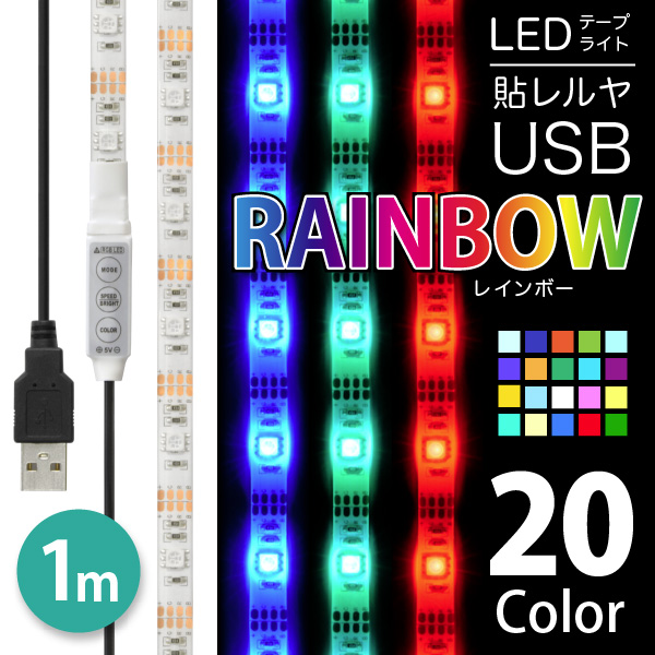 LED USB 照明 テープライト 貼レルヤ(レインボー 1m)20色カラフル照明 貼り付けて使える粘着テープ付 ハサミで切って長さ調節可能
